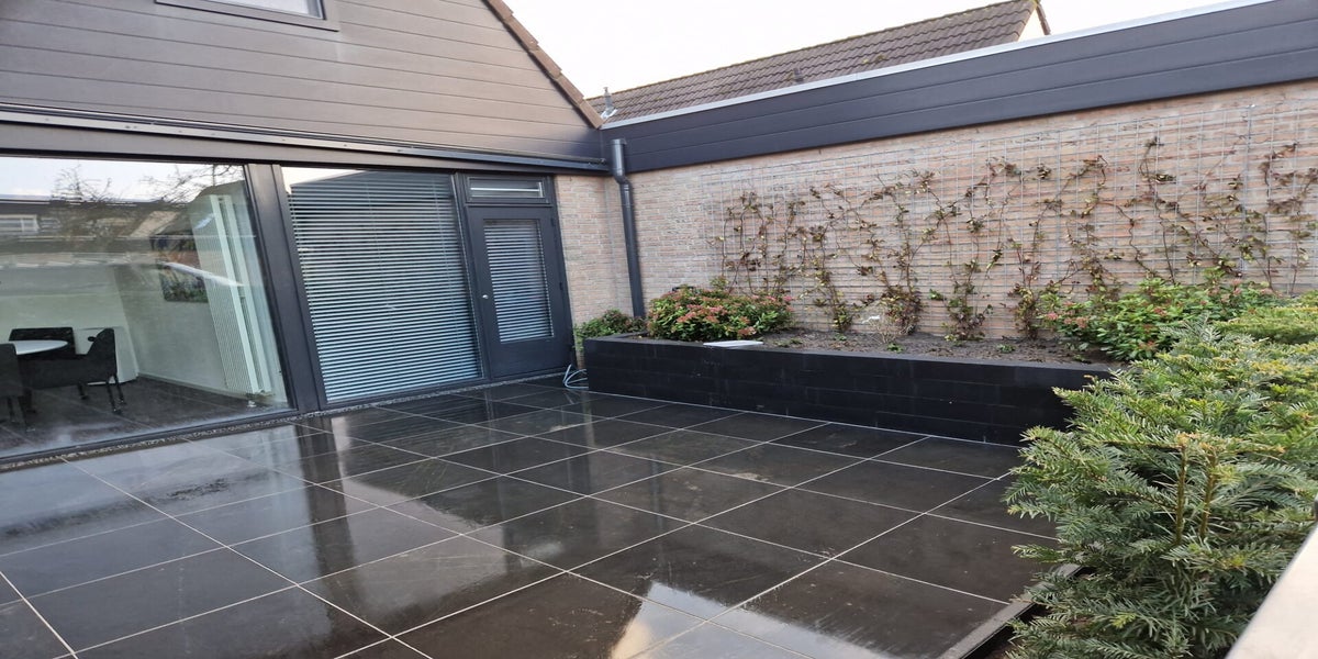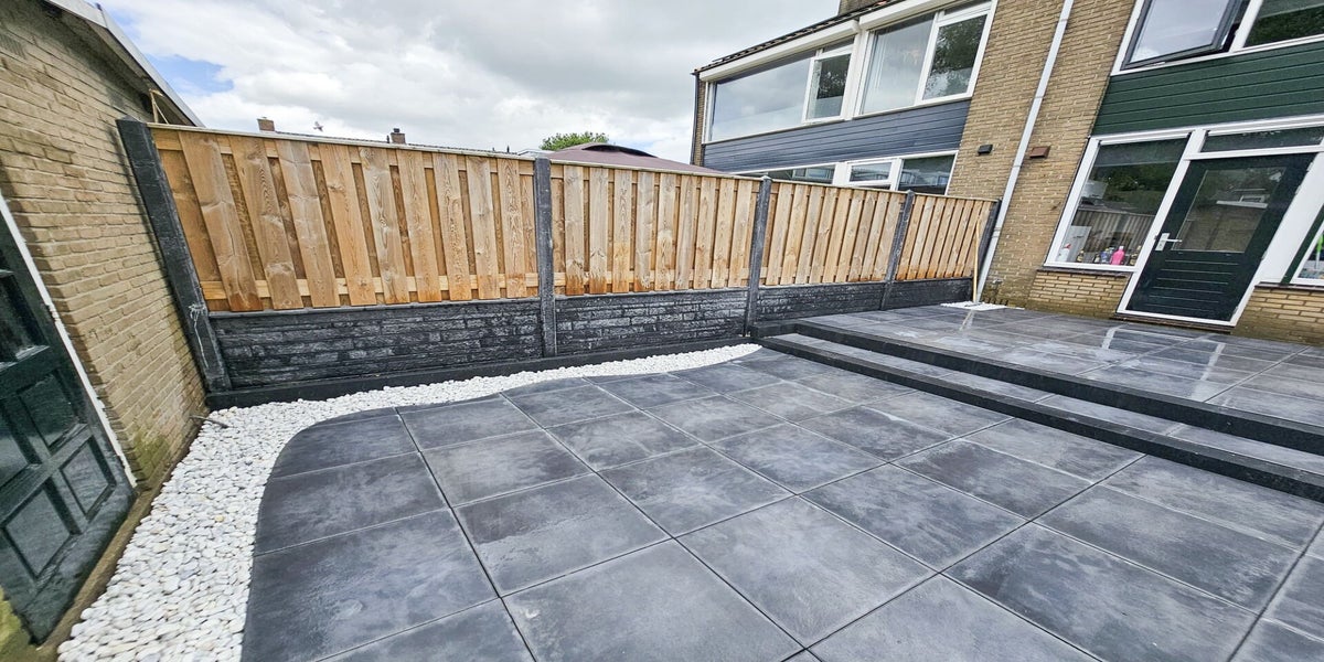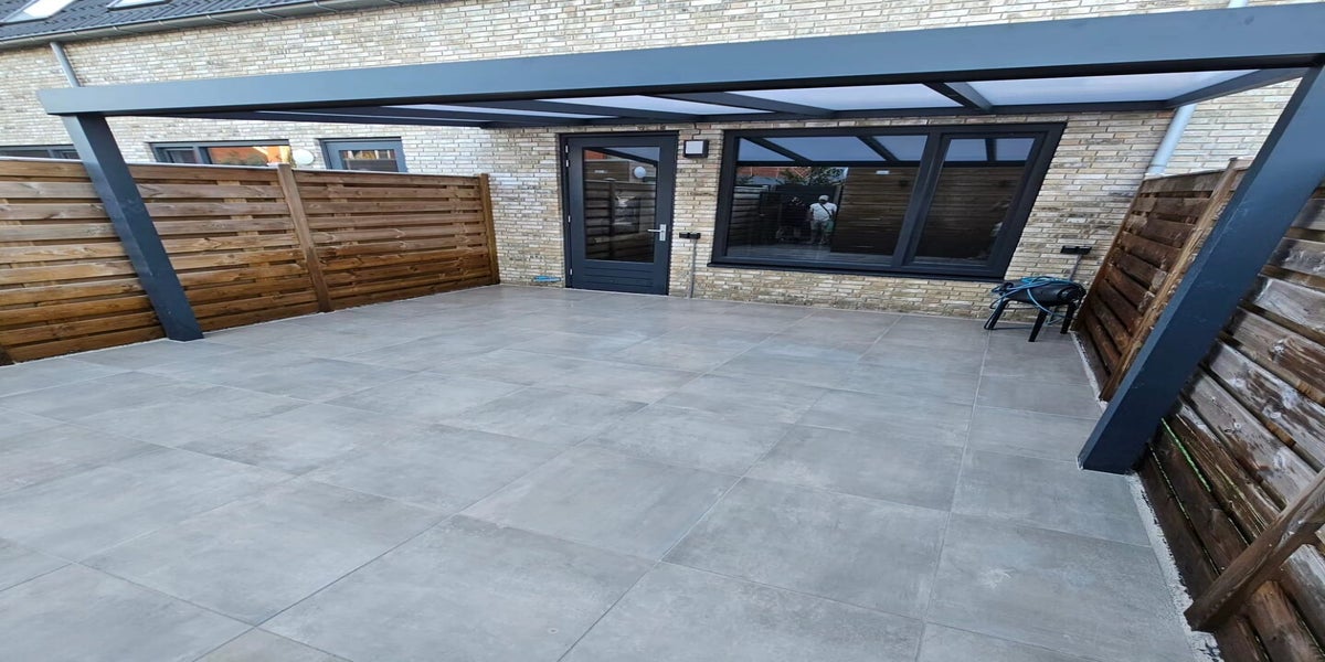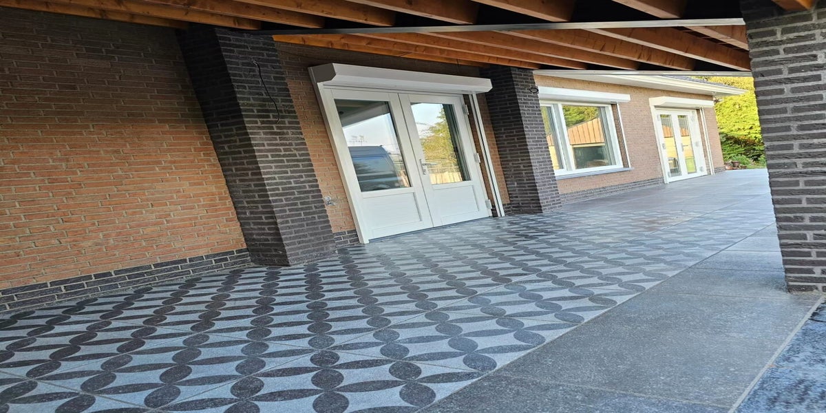 Keramische betontegels gemaakt voor in de achtertuin en normale betontegels bij de voordeur.